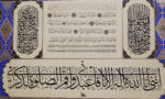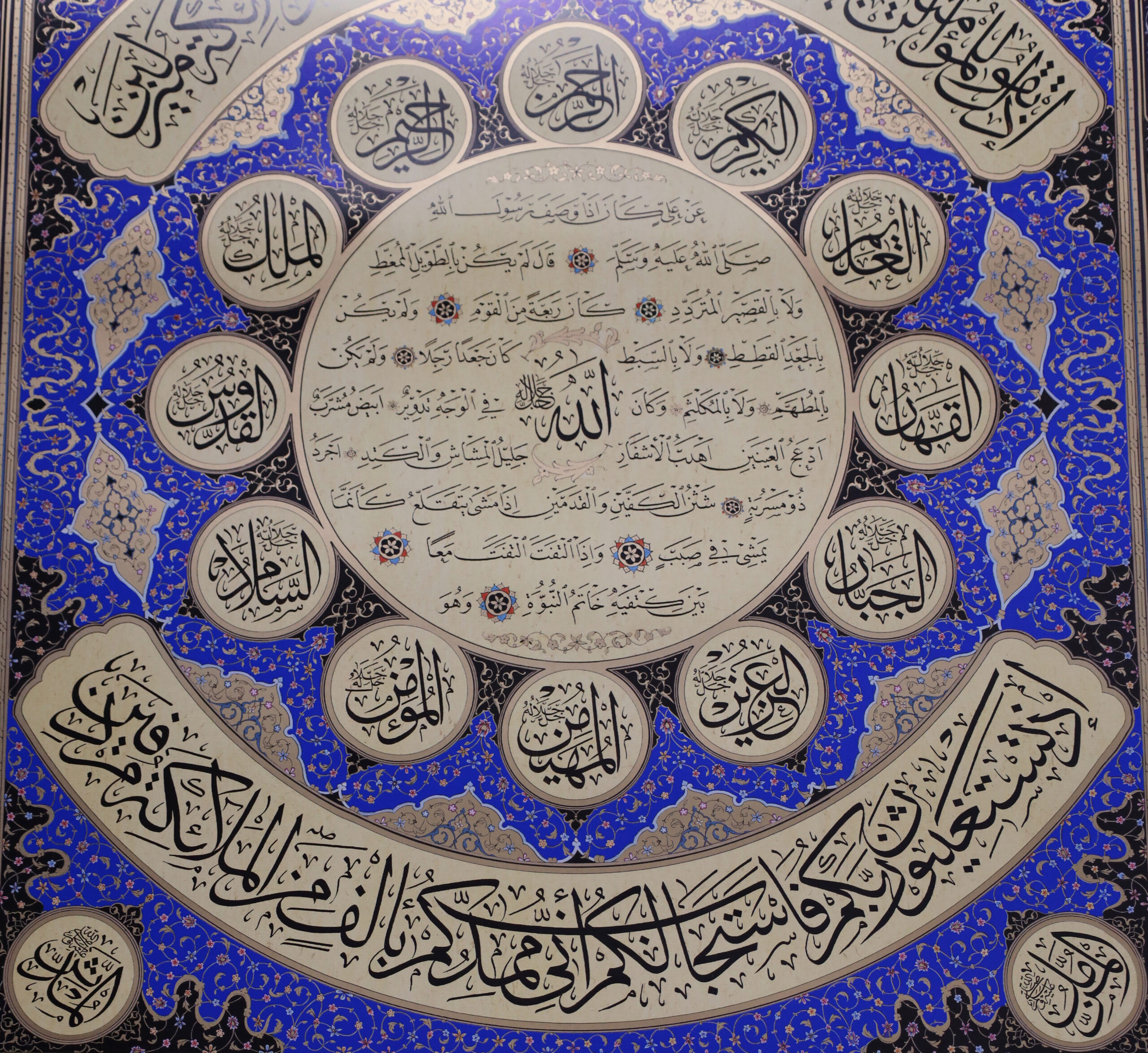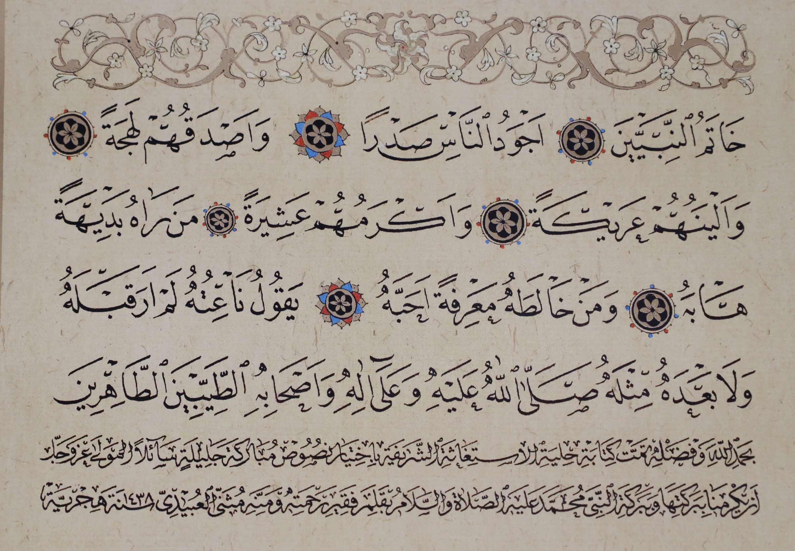 ودخل في كتابتها خط الثلث والثلث الجلي والنسخ وتحتوي وصف النبي صلى الله عليه وسلم وايات الاستغاثة