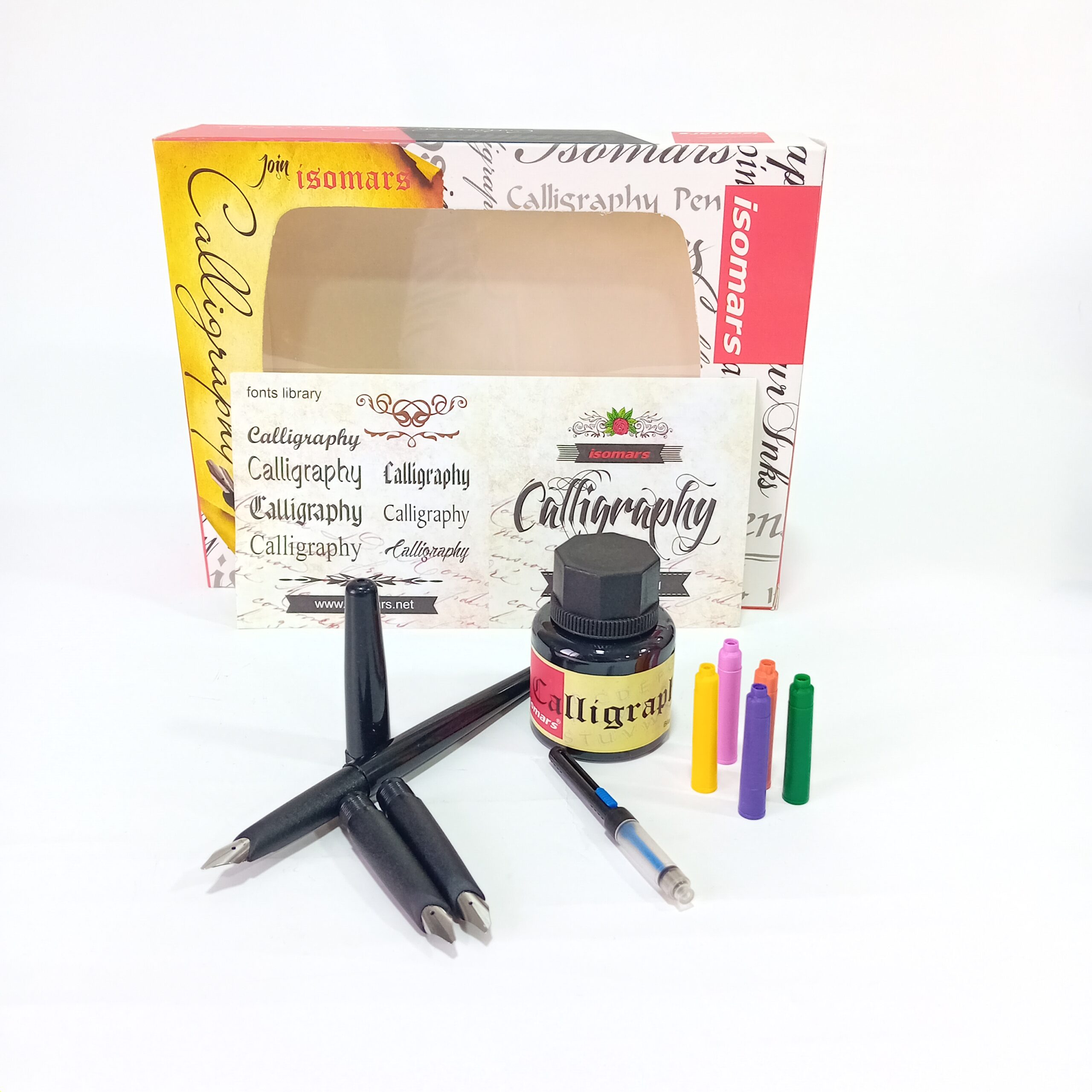 طقم قلم هندي فاخر ذو شكل انسيابي، يحتوي على 3 رؤوس بقياسات مختلفة مع 5 خراطيش حبر ملونة